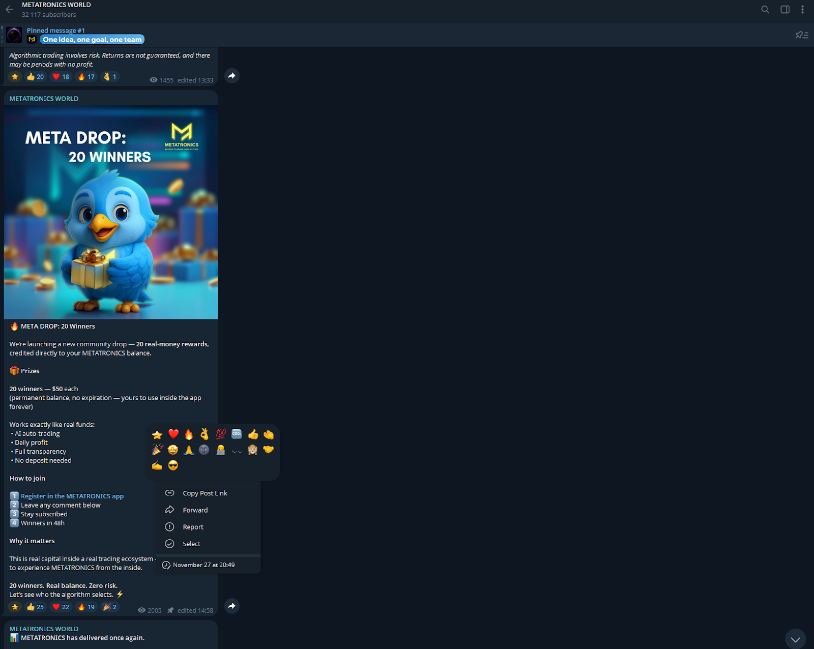 В сети сложно найти отзывы о MetatronicsBot. В официальном канале иногда публикуются лишь новости криптоиндустрии или розыгрыши, но доказательства заработка благодаря боту отсутствуют. Также на паблике отключены комментарии, а реакции ограничены только парой эмодзи, что не позволяет узнать реальное настроение подписчиков.