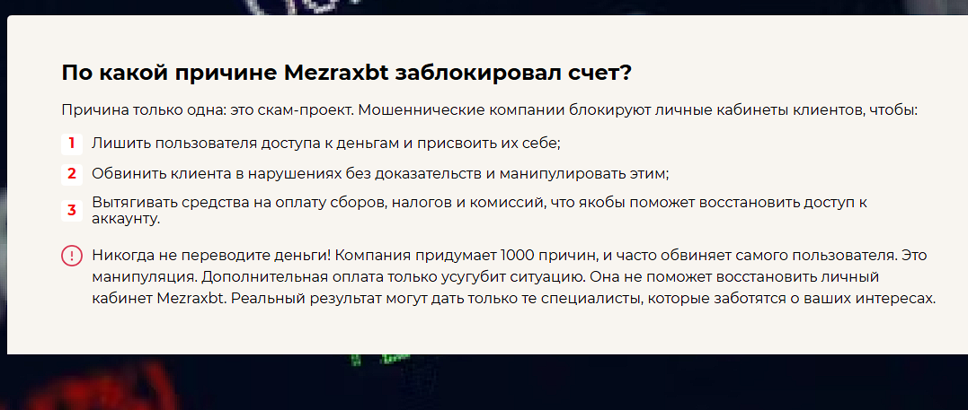 Последняя причина – ситуация с отзывами. Репутация у Mezraxbt в сети негативная, при этом откликов немного, что нетипично для «самой быстроразвивающейся компании». Пользователи жалуются на потерю денег, а вот к использованию платформу никто не рекомендует. Неделю назад сервис и вовсе попал в черный список Центробанка, что можно назвать финальным аргументом.