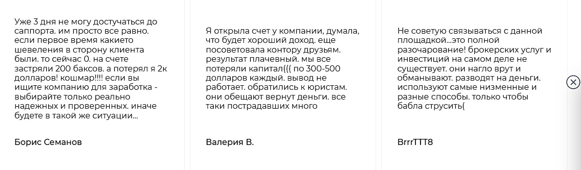 В обзорах пишут, что платформа работает по такой схеме: заманивает клиентов высокой прибылью, заставляет вложить побольше денег, а потом блокирует счет. Чтобы добиться разблокировки, пользователи якобы должны сделать встречный платеж – например, оплатить комиссию. Вот только это не помогает: деньги берут, но доступ все равно не возвращают.