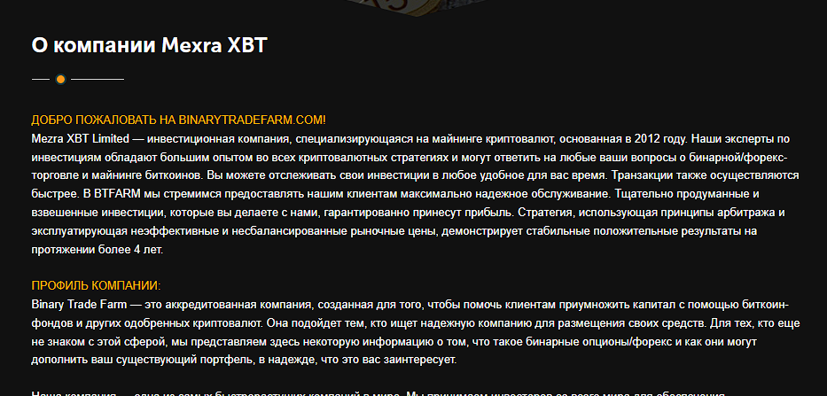Mezra XBT – инвест-платформа для работы с криптой и финансовыми инструментами. На сайте написано, что за ней стоит команда специалистов по торговле и майнингу и аналитиков, которые пользуются собственными программными решениями.
