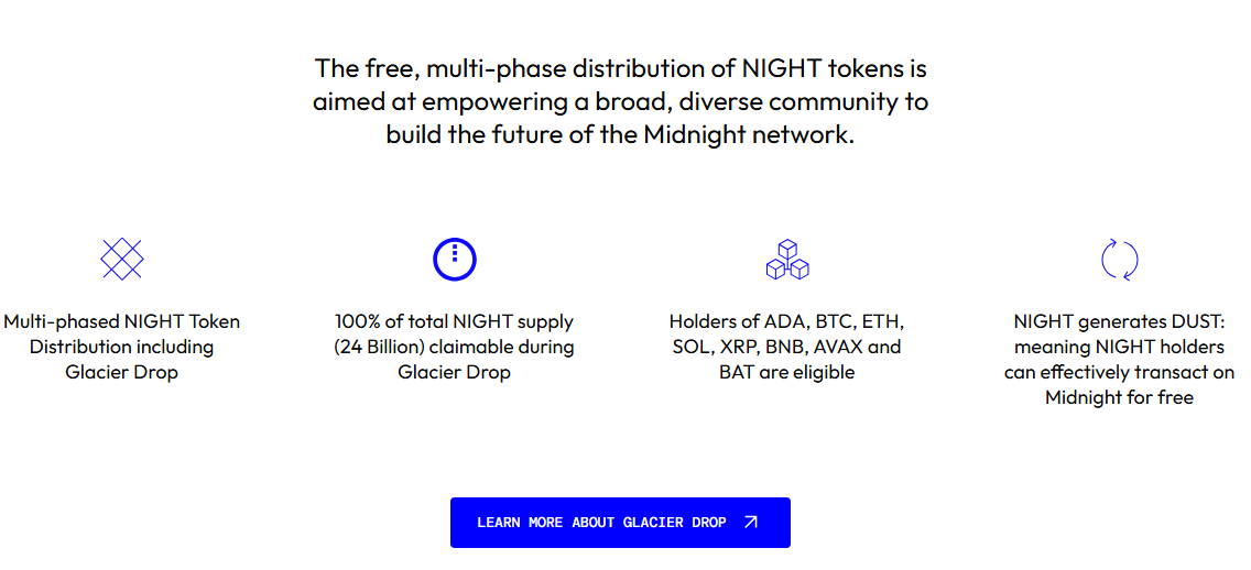 Midnight раздает все 24 млрд токенов бесплатно среди участников сообщества через аирдроп под Night Coin названием Glacier Drop. Это один из крупнейших airdrop-ов в истории криптовалюты.