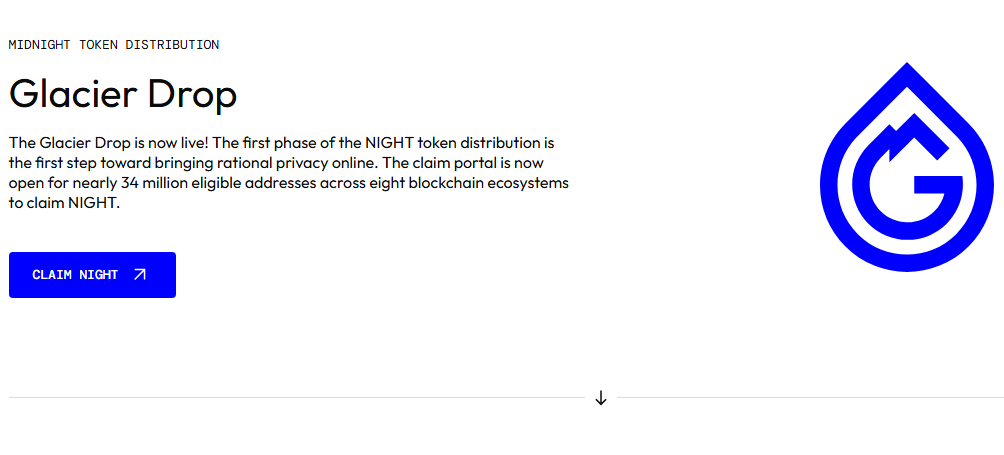 Аирдроп Glacier Drop на портале Claim Midnight GD стартовал летом 2025 года. Участвовать могли все пользователи, у которых на 11 июня 2025 года на кошельке хранилось не менее $100 в поддерживаемых активах (ADA, BTC, ETH, SOL, BNB, AVAX, XRP, BAT).