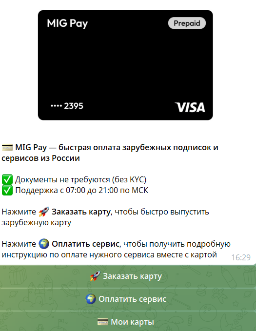 Оформление осуществляется через бот в Телеграмм. С его помощью можно не только выпустить зарубежную карту, но и оплатить нужный сервис.