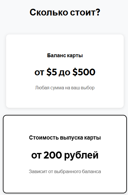 Минимальный возможный баланс электронной карты – $5, а максимальный – $500. Стоимость выпуска привязана к балансу и начинается от ₽200.