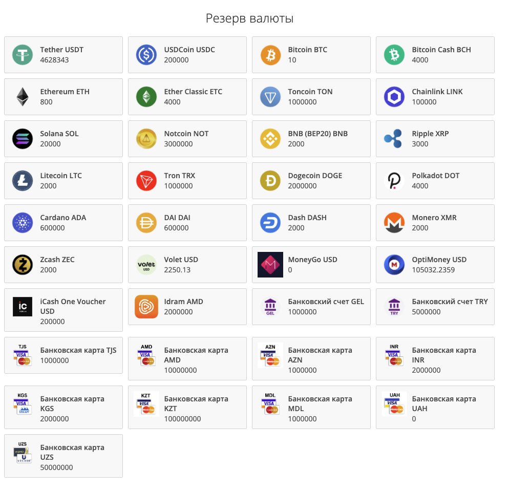 В связи с этим обмен крипты на рубли недоступен. Основные резервы выглядят следующим образом: