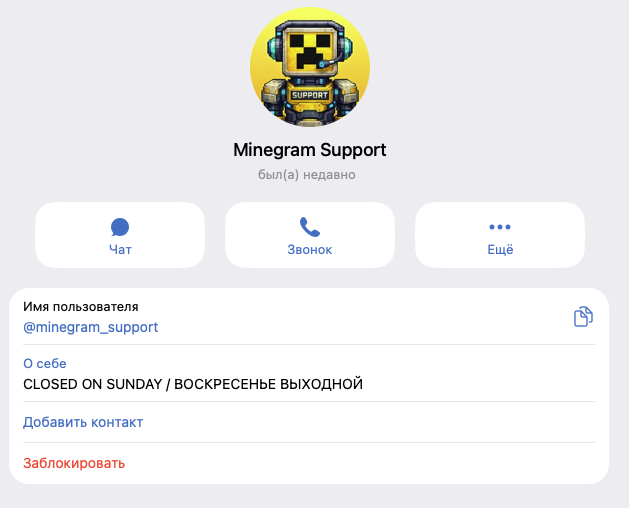 Информации о том, кто стоит за проектом даже ссылок на официальный канал внутри бота и приложения нет. Можно найти лишь ссылку на аккаунт службы поддержки.