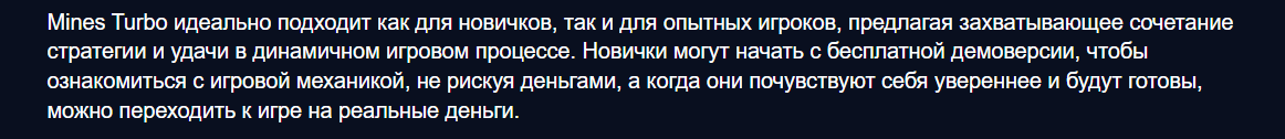 Ознакомиться с возможностями Майнс предлагается на официальном сайте разработчика – mines turbogames io, при этом о демо-слоте есть несколько рекламных статей на сторонних тематических платформах. Так, в подобных материалах прямо указано, что демо-версия позволит игрокам почувствовать себя увереннее и приступать к играм уже на свои деньги.
