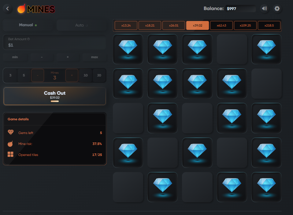 Но, разумеется, высокая вероятность выигрыша есть только в демонстрационном режиме. Так, пользователям дают выиграть даже при максимальном количестве бомб на поле: