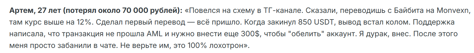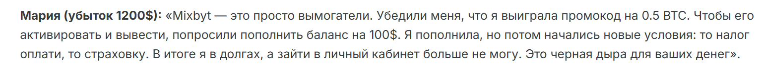 В многочисленных отзывах о Mixbyt клиенты разоблачают деятельность биржи. Они отмечают, что повелись на схему быстрого заработка. Один из трейдеров Артем говорит, что повелся на высокий уровень прибыли. После пополнения баланса на 850 USD начались сложности с выводом. Служба поддержки потребовала внести еще 300 USD для прохождения AML. После этого пользователя и вовсе заблокировали.