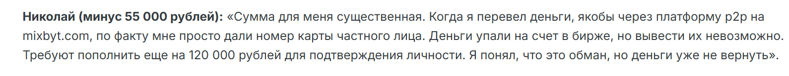Клиент Николай перевел деньги на P2P-платформу Миксбайт. Во время транзакции деньги оказались на балансе, но вывести их не удалось. Администрация потребовала внесение дополнительных 120 000 рублей.
