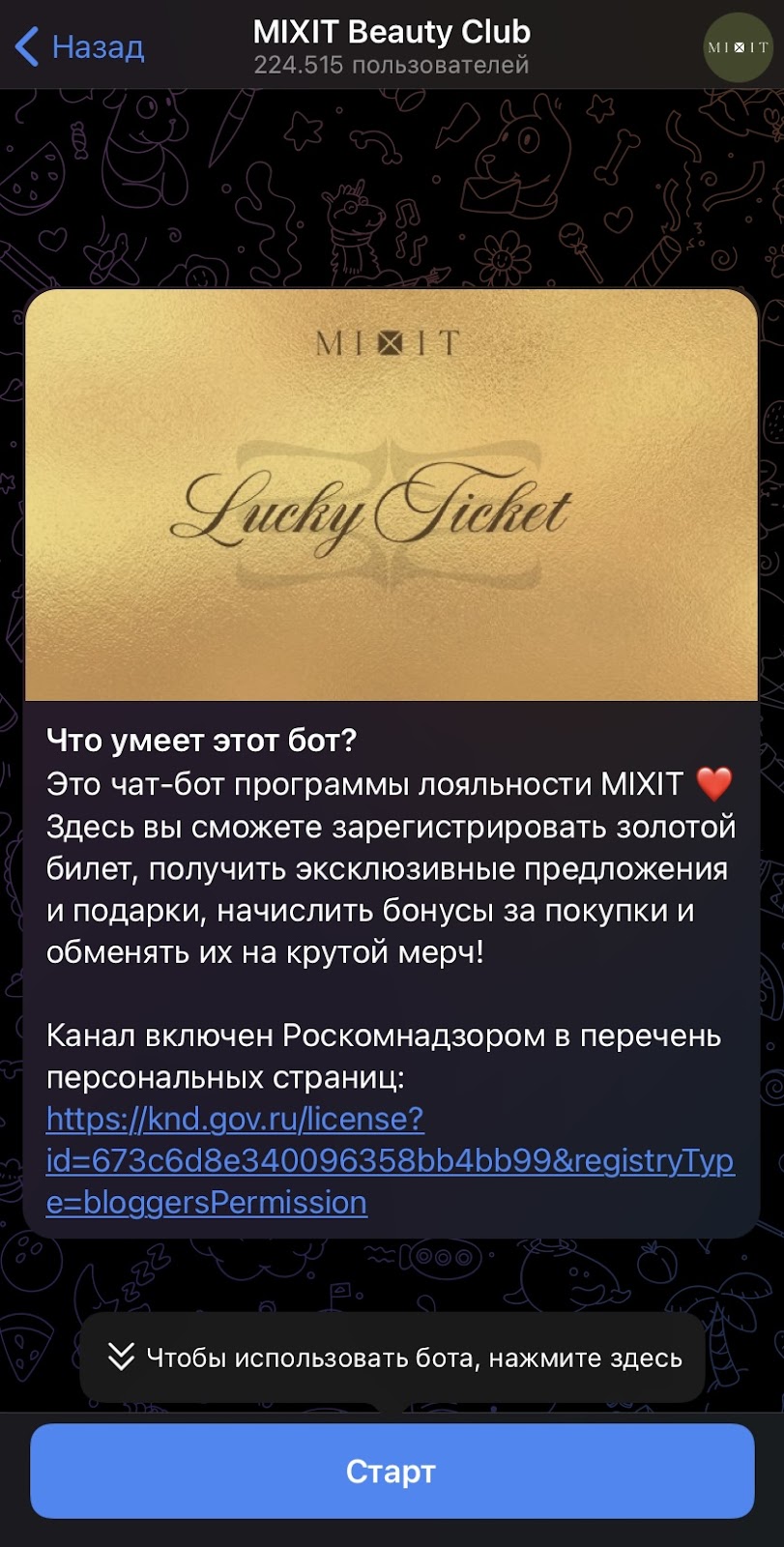 ТГ приложение Миксит Бьюти Клуб работает под юзернеймом mixit smart bot и держит аудитория из ~225000 подписчиков. Определить, реальные это люди или накрученные аккаунты, невозможно ввиду специфики канала.