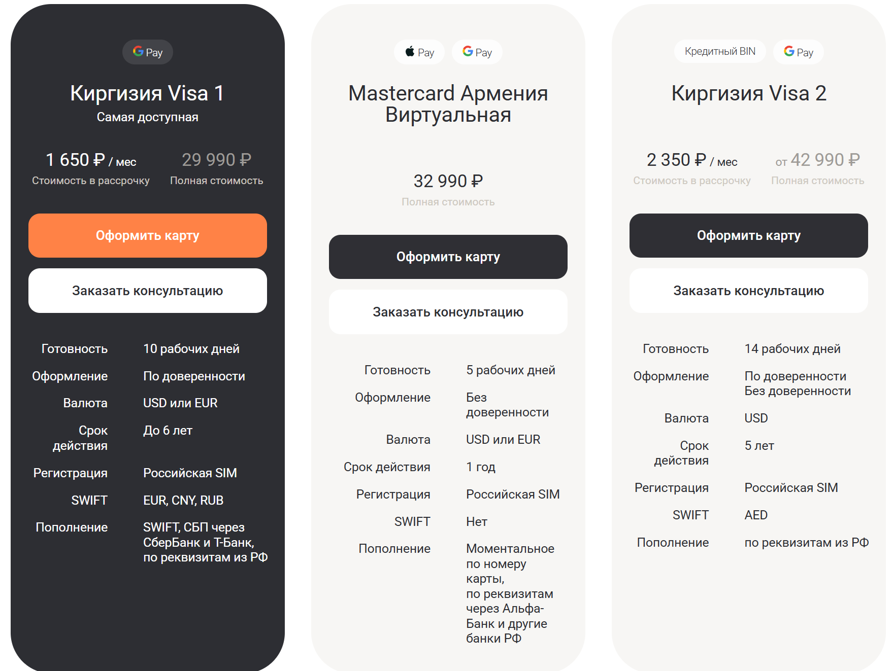 Предлагаемые карты отличаются по стоимости оформления и времени готовности. Также необходимо смотреть на поддерживаемую валюту и срок действия. Отличаются также варианты пополнения, валюты для Swift и другие характеристики.