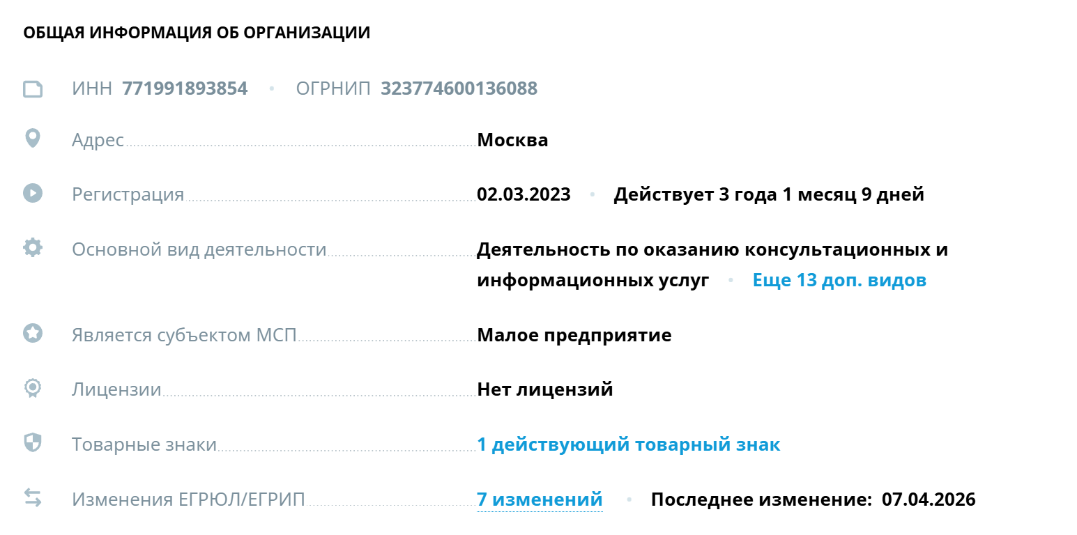 В футере указан руководитель — ИП Прокофьев Андрей Андреевич. Он действительно существует и зарегистрирован в Москве. Датой начала деятельности является 2 марта 2023-го. Основное направление — помощь в предоставлении консультации и информационных услуг.