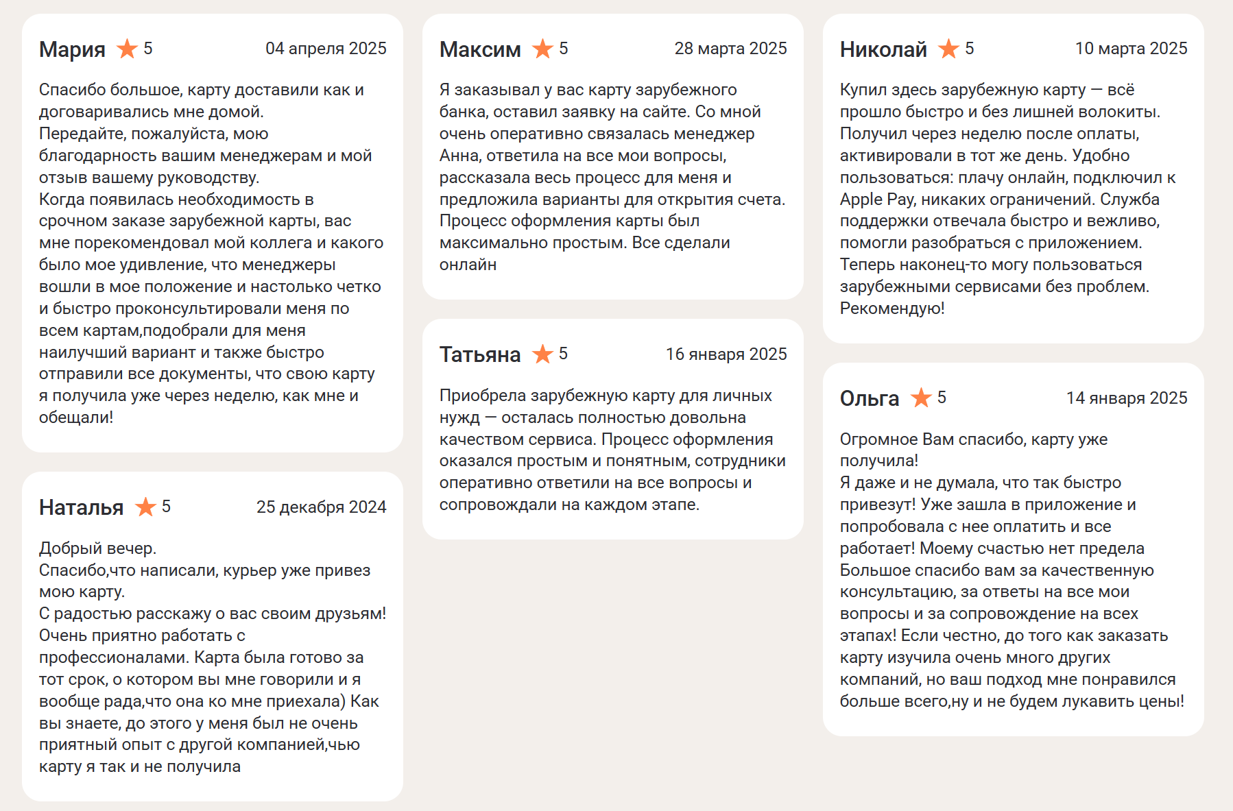 Очередная шарашкина контора, обещающая золотые горы с оформлением карт без визита в банк. Три года на рынке, а подтверждений сотрудничества с банками — ноль. Отзывы на сайте — сплошной самопиар. Не ведитесь на этот развод, иначе останетесь без денег и без карты.