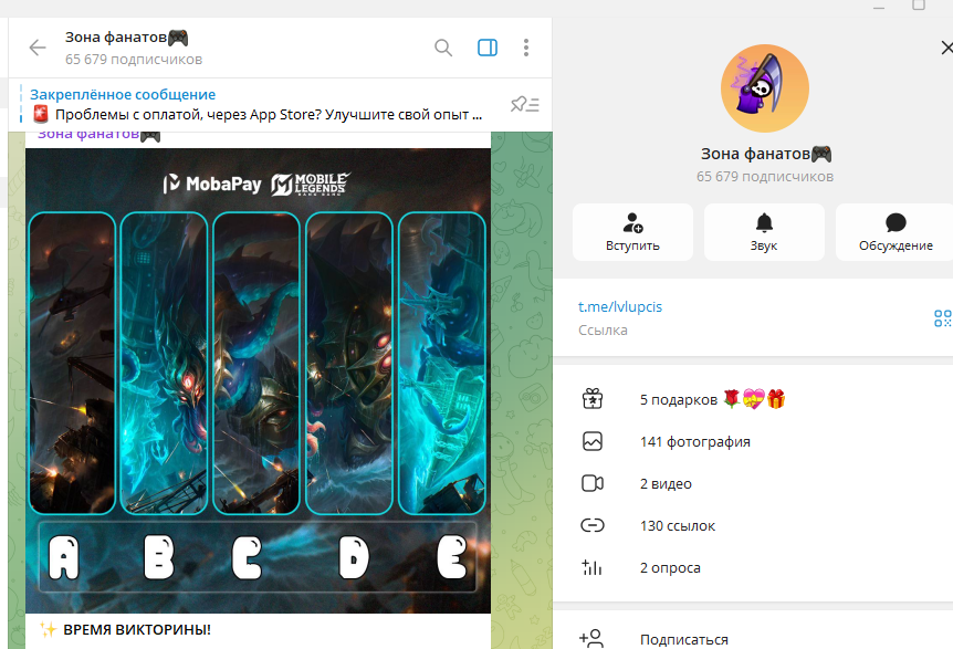 Канал в Telegram «Зона фанатов» (@lvlupcis) является основным источником оперативной информации. «Моба Пей» в тг собрала около 65,7 тысячи пользователей. Востребованность канала высокая, так как именно здесь публикуются купоны. Реакции под постами часто ограничены только 2-3 десятками позитивных эмодзи. Между тем обсуждения в чате собирают сотни комментов.