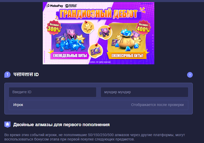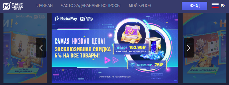 Чтобы завлечь аудиторию, на Moba Pay Com постоянно запускаются акции. Новичкам обещают бонусы – двойные алмазы за первый платеж, а купоны позволяют сэкономить до 10%.