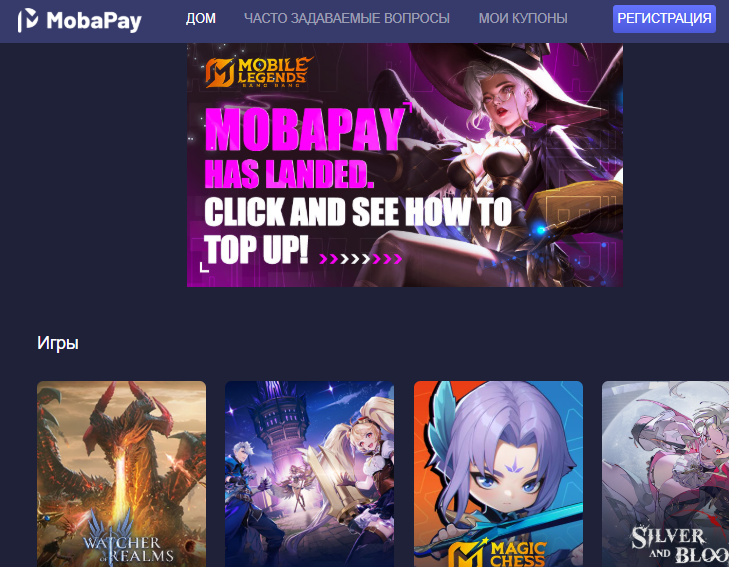 Сервис позиционирует себя как глобальный агрегатор платежей, предлагающий прямую интеграцию с игрой. Платформа имеет статус официального партнера Mobile Legends: Bang Bang. Ее официальный сайт выглядит стандартно – выбор номинала, ввод ID и оплата.