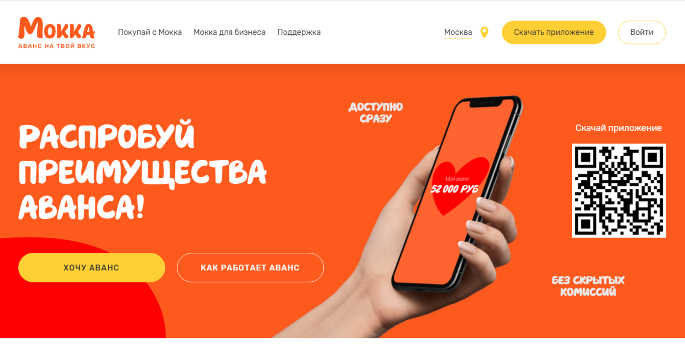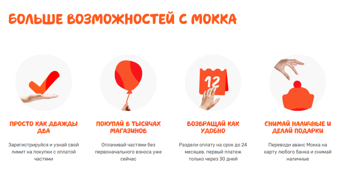 Преимущества ресурса «Мокка» авторы особо не расписывают. Они лишь указывают, что проект поможет оформить рассрочку на товары и оплачивать их частями без первоначального взноса. Разделить платеж можно на 2 года, а первый взнос совершить через месяц. Также проект дает аванс, который можно вывести на карту любого банка, а потом снять наличные.