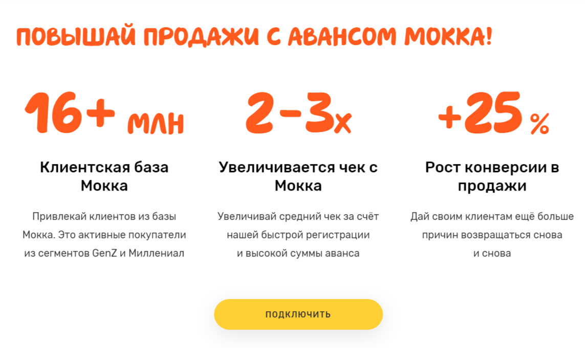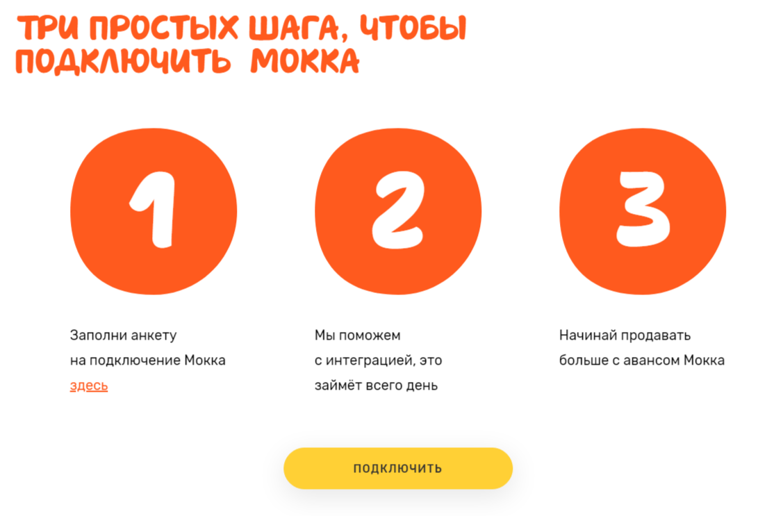 Для сотрудничества владельцы бизнеса должны заполнить специальную анкету. Менеджеры «Мокка» помогут с интеграцией системы за один день, а дальше клиенту останется только начать продавать.