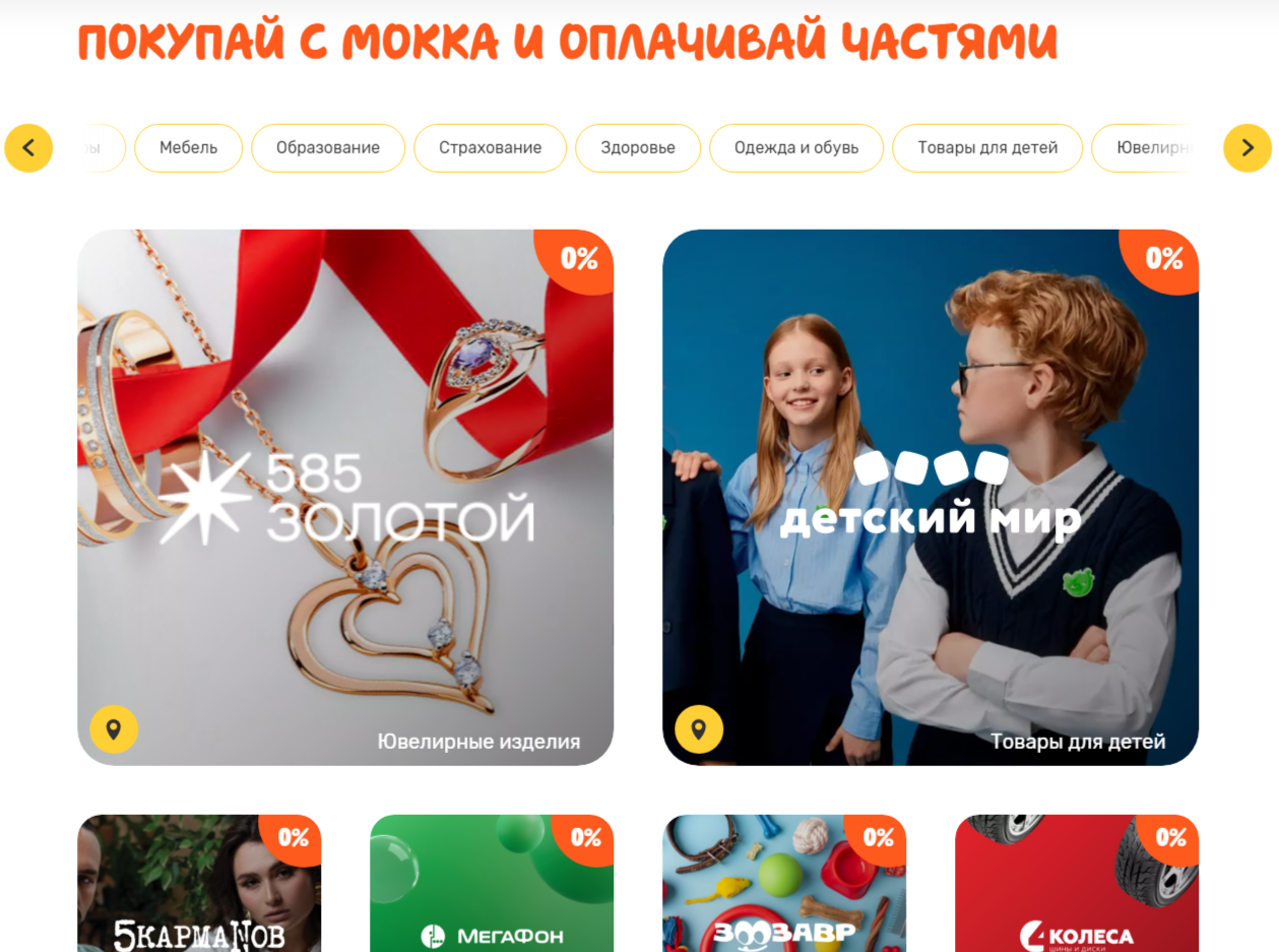 На площадке Mokka Trade находится большой список магазинов, в которых клиенты сервиса могут совершить покупки в рассрочку. Они подразделяются на такие категории: спорт, здоровье, одежда и обувь, образование, электроника, ювелирные украшения, хобби, товары для дома, мебель и аксессуары.