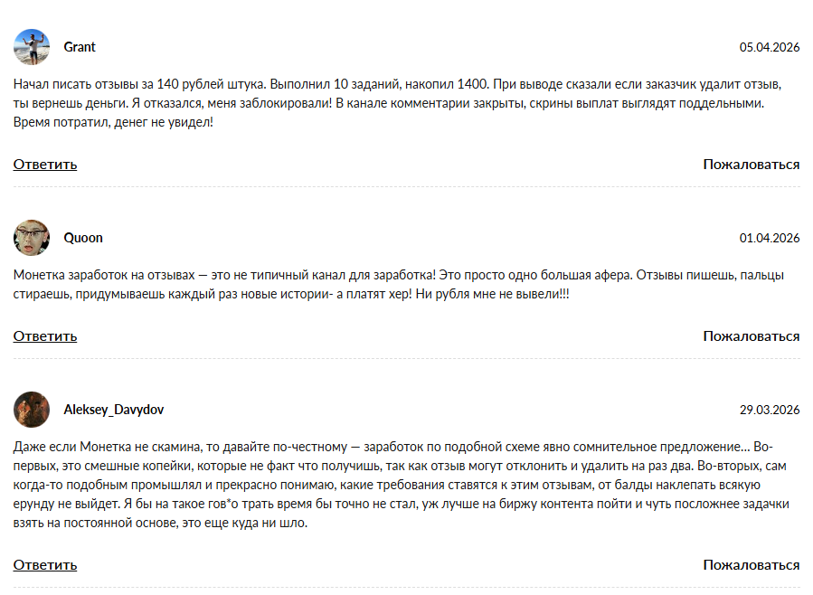 Реальные отзывы пользователей о группе Монетка Заработок на отзывах