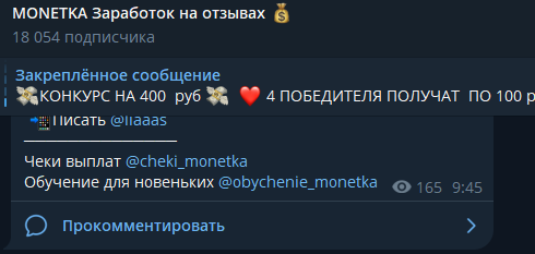 В сети люди описывают негативный опыт взаимодействия с тг каналом Монетка Заработок на отзывах. Люди утверждают, что написал не один отзыв, но так и не получили обещанные вознаграждения. Комментарии от тех, кому удалось заработать, мы не обнаружили.