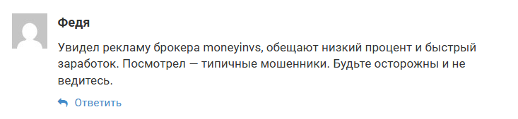 Сотрудничать с этим брокером опасно и можно потерять деньги, особенно если позже заработает функция пополнения депозита. Расскажите в комментариях, что вы думаете о работе Moneyinvs? Читайте другие обзоры о мошенниках на нашем сайте, мы постояннопубликуем новые расследования.