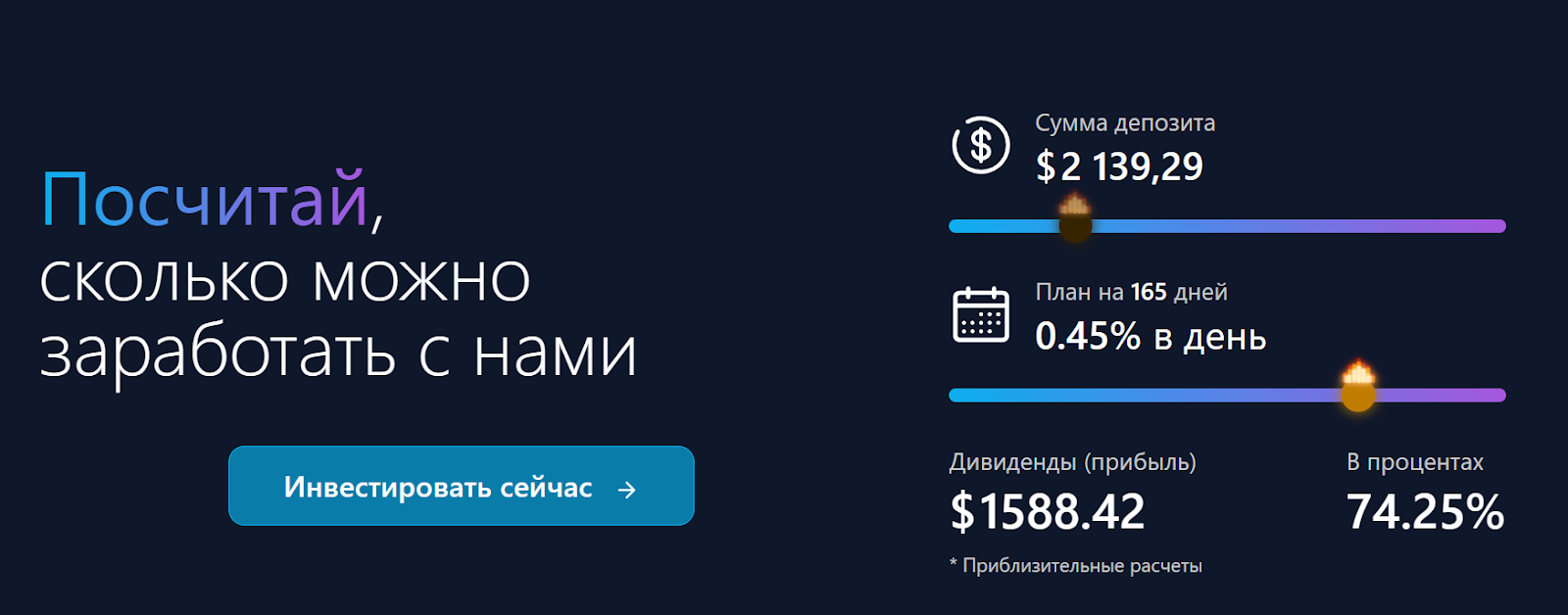 Инвестиционные тарифы представлены фиксированными планами с ежедневными выплатами процентов и установленными сроками. Пользователь сам выбирает подходящий вариант среди доступных: