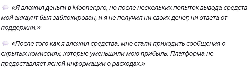 В сети встречаются отзывы о Mooner pro и практически все из них являются отрицательным. Проблема пользователей состоит в том, что они не могут вывести деньги со своего счета. Люди пишут, что им приходят уведомления о начислении комиссий, о которых ранее не говорилось. Нередко все заканчивается блокировкой аккаунта.