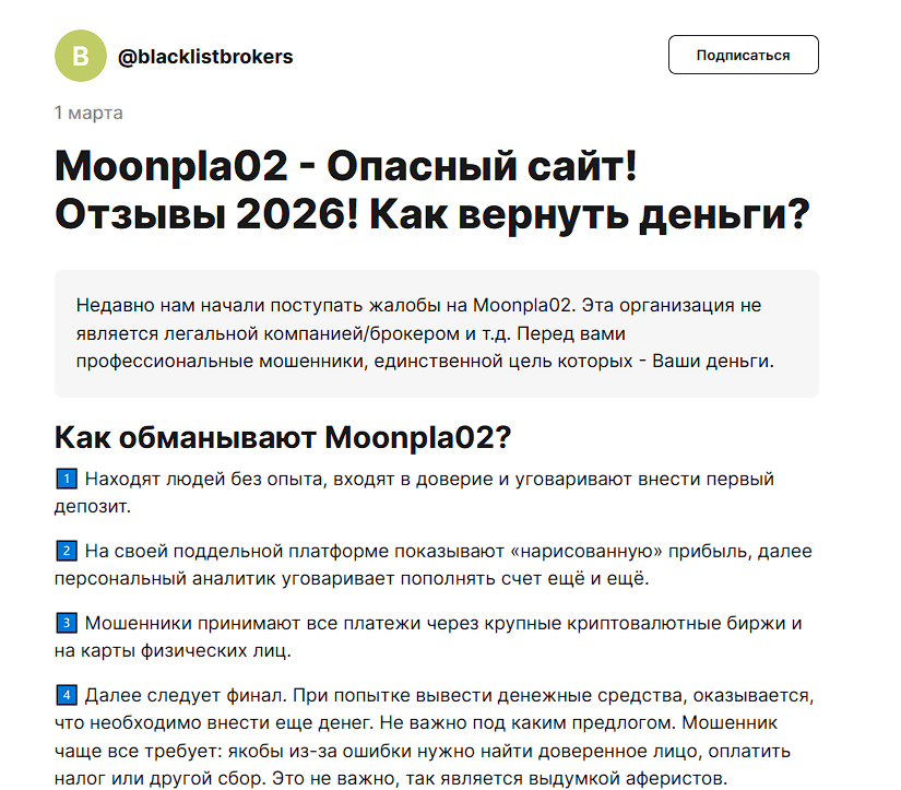 Moonpla02 – очередной лохотрон, прикрывающийся именами РБК и ВТБ. Без лицензий, а владельцы в тени. Регистрация без проверки личности – явный признак развода. Не ведитесь на этот скам!
