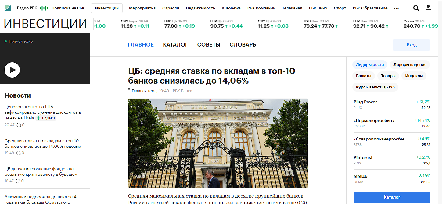 Начнём с РБК – это медиахолдинг и информационный портал о финансах и инвестициях, а не брокер. На официальном сайте RBK действительно есть раздел «Инвестиции», но там находятся тематические новости, а не инвестиционная платформа.