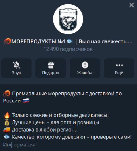 «Морепродукты №1» — канал в мессенджере Telegram, в котором пользователям предлагают приобрести премиальные морепродукты по самым низким ценам. Клиентам магазина обещают только свежие и отборные деликатесы, а также доставку в любой регион России.