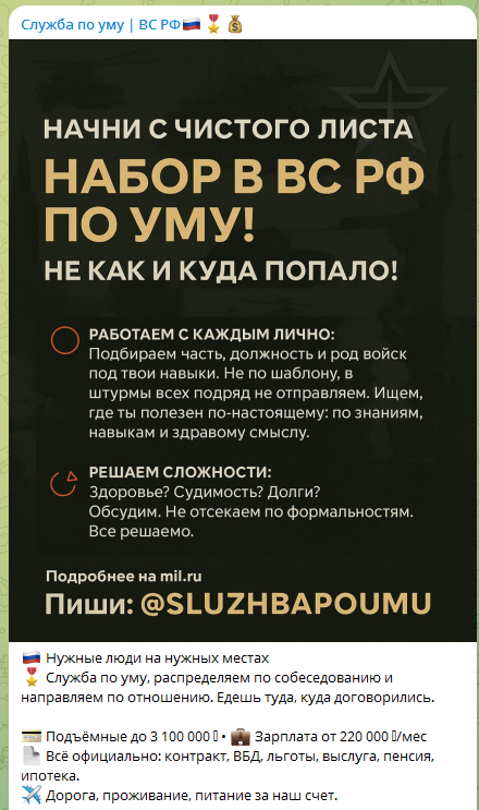 В группе «Служба по уму ВС РФ» публикуется список вакансий с кратким описанием должностных функций. Автор телеграм-комьюнити утверждает, что люди могут рассчитывать на зарплату величиной от 220 000 рублей в месяц. Также организатор портала заявляет, что юзеры, заключившие контракт смогут получать в перспективе даже от 2 400 000 рублей в месяц.