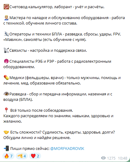 Создатель Telegram площадки обещает фолловерам, что документы оформляются официально, и деятельность кадрового агентства осуществляется прозрачно. В группе много мотивационных постов. Михаил обещает помочь выбрать наиболее подходящую вакансию и решить личные проблемы. Заявки на заключение контракта принимаются в ТГ через ЛС.