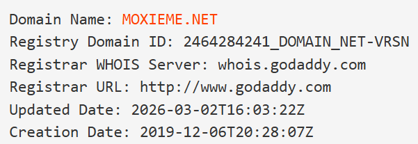 Домен «Моксиеме» создан в 2019 году, но в 2026 данные в реестре обновляли. Эта площадка фактически имеет «нулевой стаж работы», что негативно отражается на ее репутации.