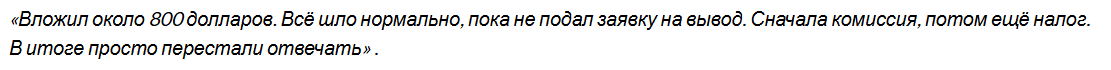 Второй пользователь получил «бумажную прибыль», которая отображалась на сайте. Но снять деньги он тоже не смог.