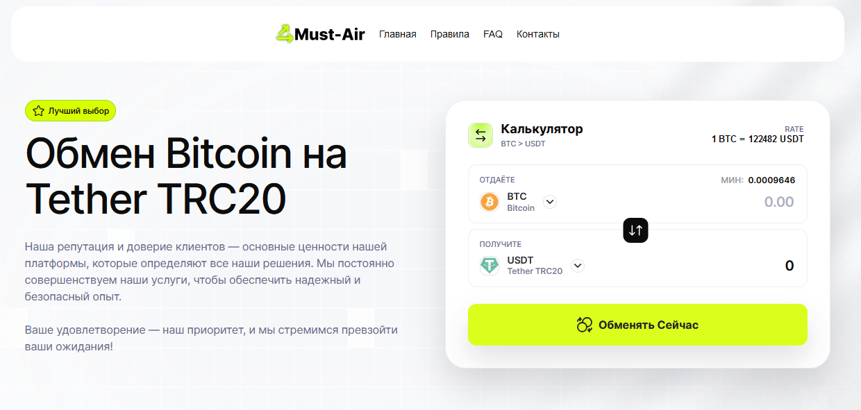 Криптовалютный обменник must air com – сервис, на сайте которого обещают простой, быстрый и выгодный обмен цифровых активов. На сайте большое количество отзывов о работе сервиса, но на мониторингах площадки нет. Мы нашли целый ряд факторов, которые указывают на то, что работа с платформой является крайне опасным решением. Поделимся информацией в ходе обзора.
