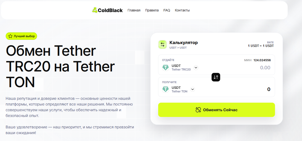 Попробовал обмен всё прошло изи. Потом бахнул на 50к, и тут начался ад! Операция зависла, саппорт в ТГ уже удалён. С меня требуют страховку, потом налог, потом комиссию! Пока я тупил, они завандалили мои бабки. Сайт клон какого-то coldblack, всё один в один. Ща уже и сайт заблокан. Чисто схема кидалово, встрял по полной!