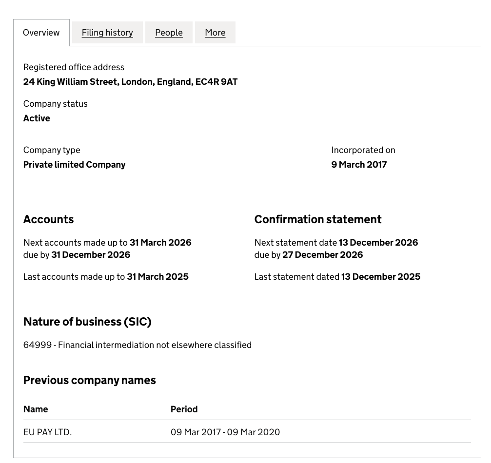 Компания My EU Pay LTD была зарегистрирована в 2017 году в Великобритании.