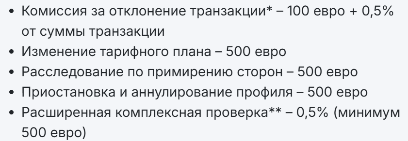 При отклонении транзакций взимается комиссия 100 евро + 0,5%. Кроме того, есть и другие дополнительные платежи,