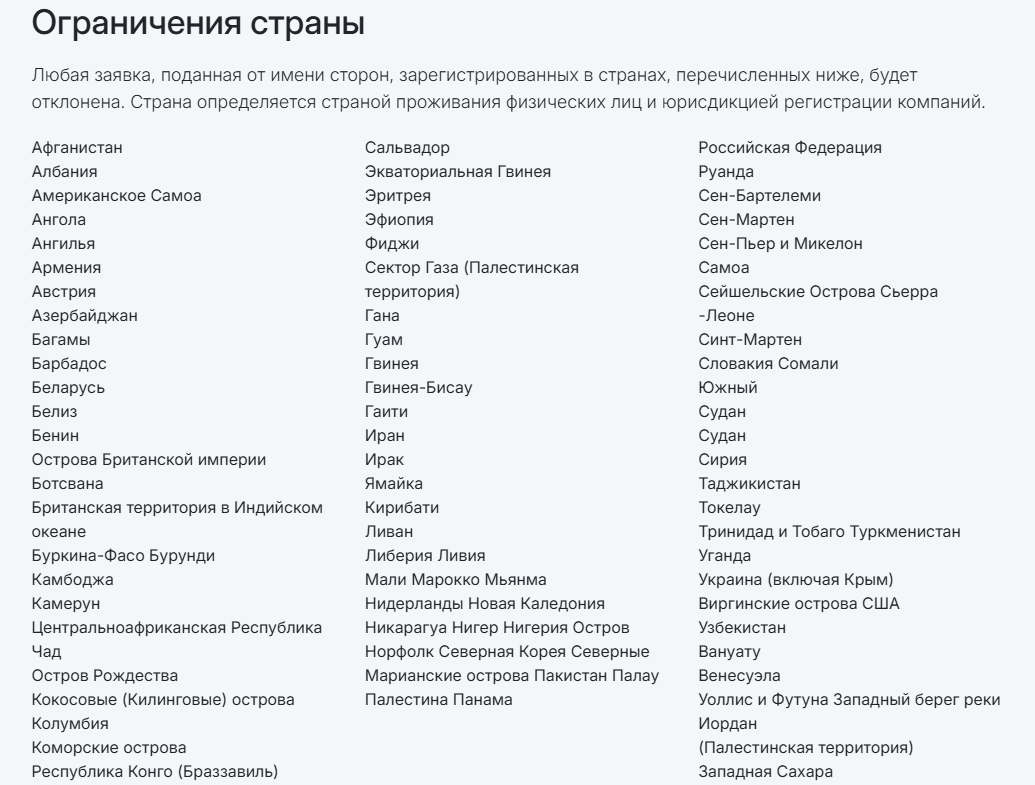 Другого лицензирования компания не проходила, хотя услуги платформы оказываются в десятках стран. Правда с точки зрения российского бизнеса в проекте нет особого смысла, так как РФ входит в список стран из списка ограничений: