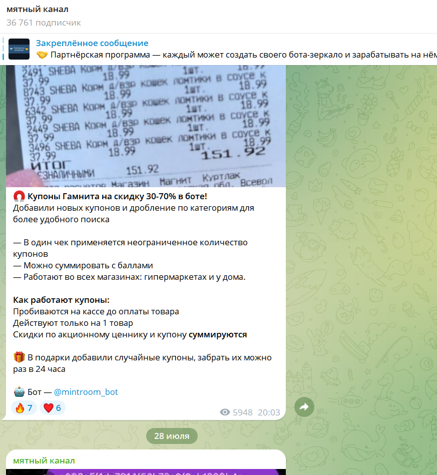 Но при изучении постов на канале «Мятная комната» Телеграм, выяснилось, что обновление предложений проводится редко. Новые посты со скидками и акциями появляются примерно один раз в три – пять дней.
