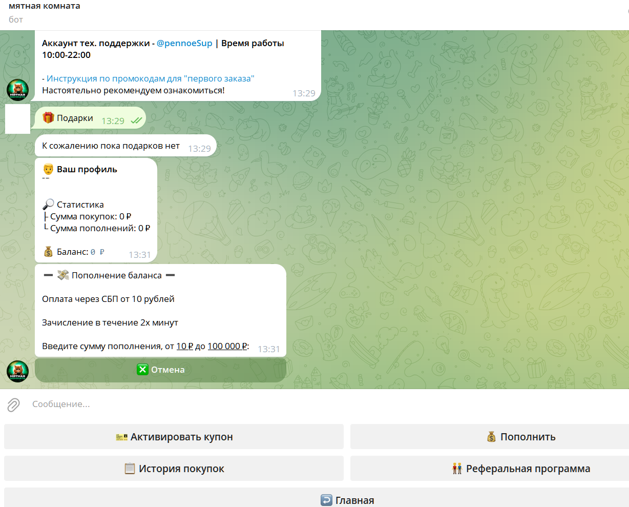 Можно оплатить услуги программы в крипте через бот криптовалют или перевести деньги в рублях через сервис «СБП». Минимальная сумма пополнения 10 рублей, максимальная – 10 000 рублей.