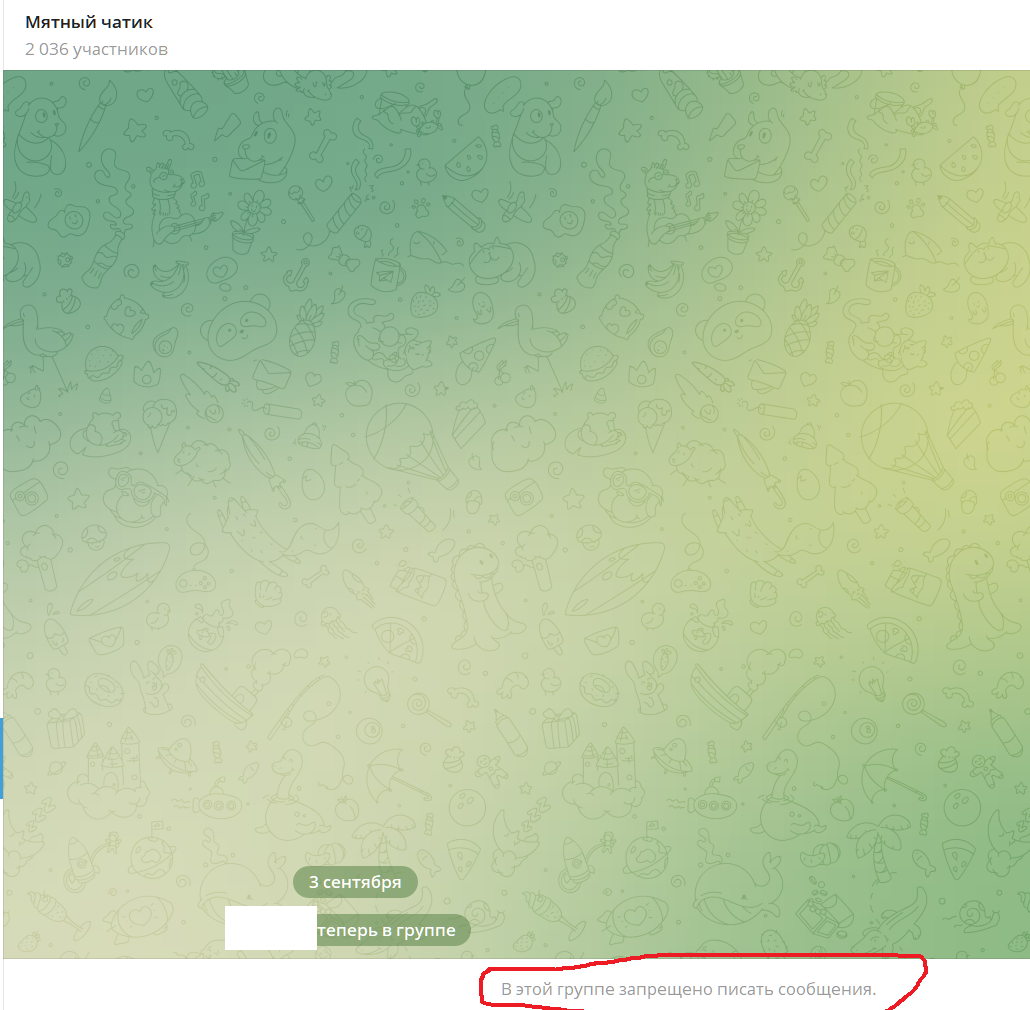 Каждый желающий может записаться в «Мятный чатик» ТГ, насчитывающий 2036 участников. Но увидеть переписку пользователей в этом чате невозможно, вся информация скрыта. Наверное, доступ к переписке получают VIP подписчики проекта.