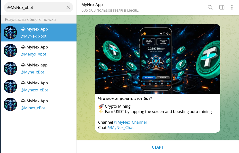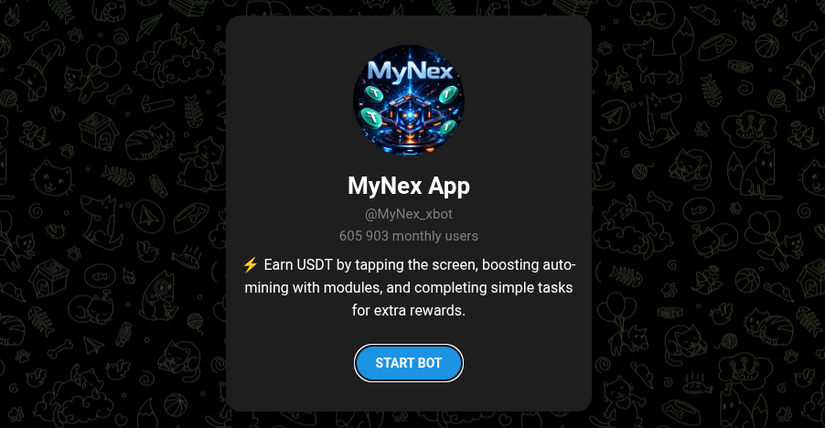 Mynex APP — телеграмм-бот, разработчики которого обещают легкий заработок на кликах и автоматическом майнинге криптовалюты. Создатели сервиса завлекают новичков сказками о быстром доходе в токенах USDT без сложных настроек и глубоких познаний рынка.