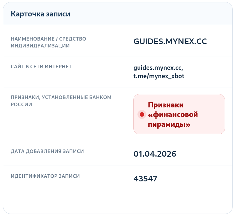 С юридической базой у проекта Mynex APP все очень плохо. У компании нет официальной регистрации, адресов реальных офисов и лицензий на финансовую деятельность. Команда разработчиков сохраняет стопроцентную анонимность. Центральный банк Российской Федерации уже обратил внимание на эту активность и внес смежный домен Mynex Cc в черный список с признаком финансовой пирамиды. Оригинальный рабочий домен Mynexapp Site и вовсе перестал работать. Поэтому их заявления про надежный заработок и безопасность депозитов — ложь.