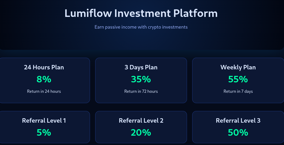 На новом зеркале Lumiflow мошенники обещают нереалистичную доходность — 8% за 24 часа или 55% за одну неделю. Дополнительно они продвигают многоуровневую партнерскую программу с комиссиями до 50%. Подобные цифры физически не может обеспечить ни один честный хедж-фонд в мире. Главная цель — заставить вас приглашать друзей в эту финансовую ловушку.
