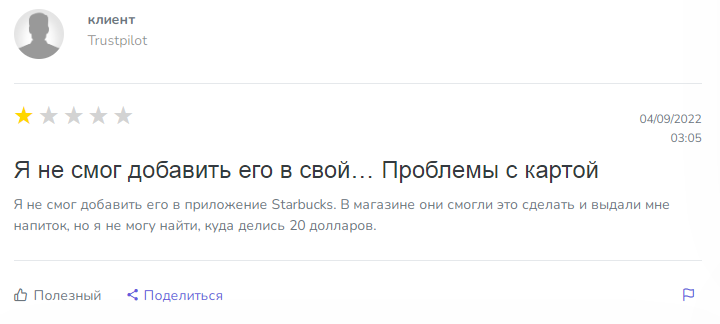 Другой исполнитель в отзыве о платформе MyPoints com по заработку в интернете на русском заявляет, что не может добавить подарочную карту для покупки напитка. В кофейне смогли добавить карту, но у клиента похоже дополнительно списалось $20.