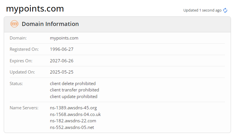 Проверка домена сайта My Points com для заработка в интернете на русском языке показала, что площадка была зарегистрирована в 1996 году. Информация на ней была обновлена единожды в 2025 году. У проекта нет лицензий и прочих сертификатов, открывающих возможность легального предложения услуг на территории России.