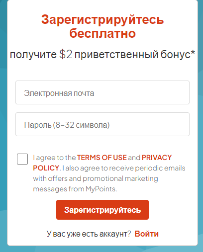 Клиенты MyPoints con должны будут пройти регистрацию для доступа к заданиям на «МуПоинтс ком». Им нужно ввести электронную почту, имя, номер телефона для получения ссылки, открывающей вход на платформу. За регистрацию клиент получает $2 бонусом. Он не сможет вывести их, пока не заработает в десять раз больше.